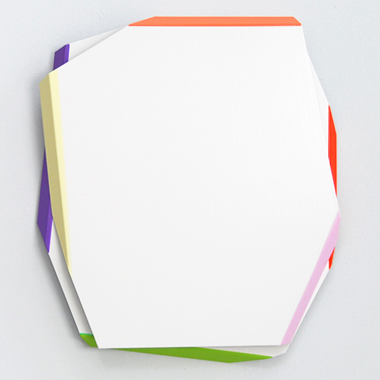 Die Farbschichten sind als räumlich geschichtete Struktur wahrnehmbar und materialisiert aufgesetzt, als eigenständige Schicht, vorgesetzt gleich einer Blende. Dahinter ist ein als reliefartig ausformuliertes weisses Trägerstück, das sich mit der vorgehängten Farbblende zu einem Farbkörper vereint. Diese Farbschicht ist nicht nur formal, sondern auch physisch ausbalanciert.